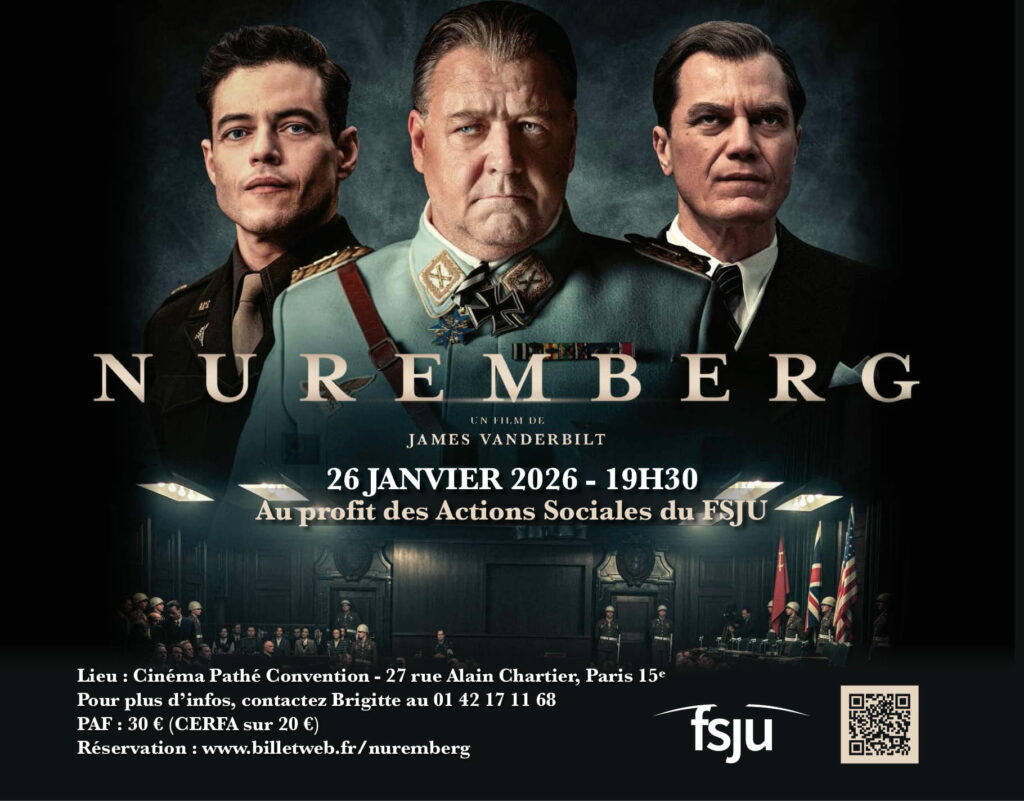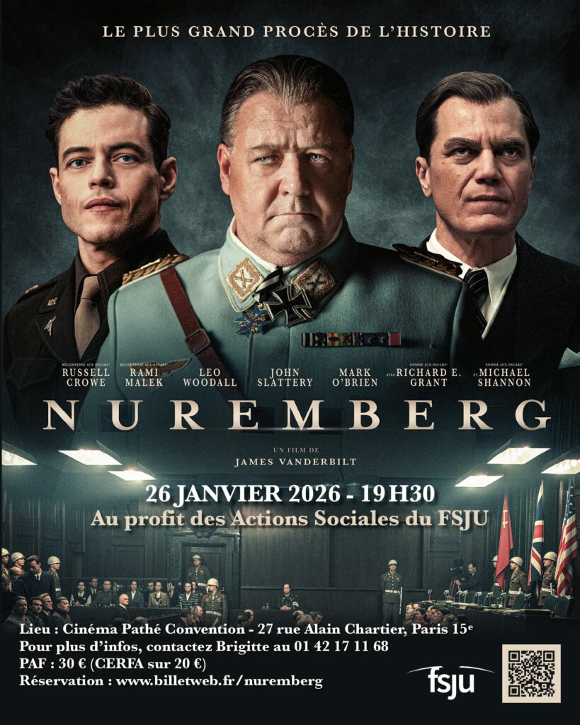 Le FSJU vous convie à une soirée exceptionnelle autour du film Nuremberg, le plus grand procès de l’Histoire. Cette projection sera au profit des actions sociales du FSJU