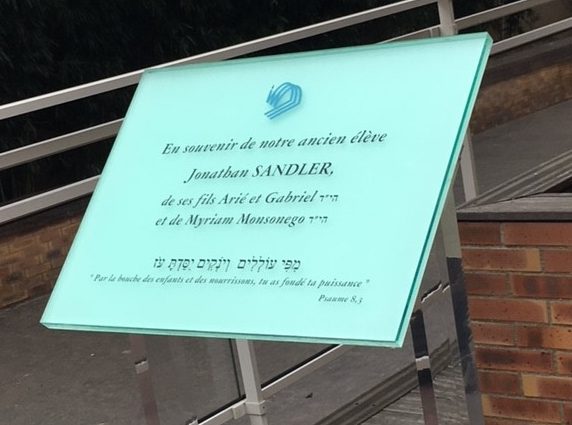 Au cours d’une émouvante cérémonie, au lendemain de la date anniversaire de la tuerie de l’Ecole Otzar Hatorah, une plaque commémorative a été inaugurée à l’Ecole Maïmonide Rambam de Boulogne (92) à la mémoire de Jonathan Sandler (ancien élève de l’école), de ses fils Gabriel et Arié, et de Myriam Monsonego (zal). Après quelques mots d’accueil du président du groupe scolaire, Claude Sarfati, plusieurs personnalités ont pris la parole dans la synagogue de l’école : Me Ariel Goldmann, président du FSJU-AUJF et avocat de la famille Sandler, le Grand Rabbin Alain Goldmann, Samuel Sandler et le Grand Rabbin de Paris, Michel Gugenheim. Ariel Goldmann a rappelé les liens forts unissant sa famille à la famille Sandler et le combat mené aux côtés de cette dernière dans le cadre du procès devant la Cour d’Assises, avec son confrère Elie Korchia, également présent. Après des prières récitées par le rabbin de Boulogne Didier Kassabi, Samuel Sandler a remercié Ariel Goldmann, à l’origine de cette cérémonie et a rappelé l’attachement de son fils à l’Ecole Maïmonide Rambam. Après un hommage rendu par les élèves, la plaque fut dévoilée dans la cour de l’école. De nombreuses personnalités ont assisté à cette cérémonie dont les députés Meyer Habib et François Pupponi, Jerémy Redler (représentant la présidente de la région), les élus boulonnais Léon Sebbag, Michel Amar, Daniel Benharoun, Patrick Petit-Ohayon, directeur de l’Action Scolaire du FSJU, Soly Lévy, vice-président du FSJU et Mmes Lafitte et Lévy, directrices que Mr Sandler a chaleureusement remercié.